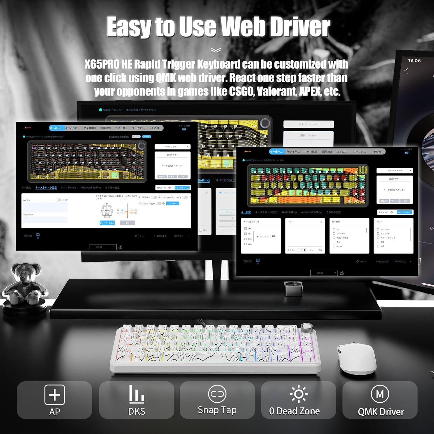 - 【0.01mm RT Precision - Personalized Key Customization】 With the X65 PRO HE Keyboard, each key can be individually customized with an industry-leading 0.01mm precision. Set actuation points anywhere from 0.1mm to 3.4mm to match your playstyle—whether you need ultra-fast response for FPS games like CS2 and Valorant or a more controlled keystroke for precise typing, the X65PRO HE adapts to your every move. This technology ensures faster resets and superior control, allowing for effortless strafing, counter-strafing, and rapid key combos.